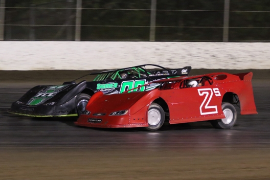 Kyle Shaw (2s) passes Monte Skinner with three laps remaining to win $3,000 at Magnolia.