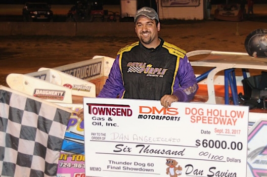 What won the race: Polesitter Dan Angelicchio of Greensburg, Pa., completed his biggest career weekend Saturday at Dog Hollow Speedway with a $6,000 victory in the 60-lap feature that gave him a sweep of the Thunderdog Showdown. Angelicchio, who won Friday's $2,500 race on the final lap, didn't require late-race dramatics this time, racing off the pole position to lead every circuit after outdueling eventual runner-up Kyle Hardy of Stephens City, Va., in the early stages.