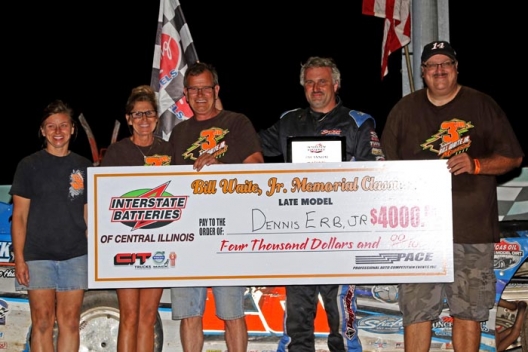 What won the race: Capitalizing on Chris Simpson's turn-four slipup heading to the white flag, former track champion Dennis Erb Jr. of Carpentersville, Ill., earned $4,000 Sunday in the Late Model portion of La Salle Speedway's Bill Waite Jr. Memorial Classic. The hub-hugging Erb slid in front of Simpson exiting turn four to lead the final two laps.
