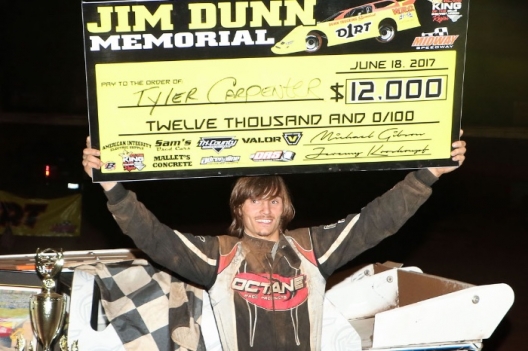 “I’ll tell you what, I couldn’t do it without my dad,” said Carpenter, who pushed his 2017 feature-win total to 25 with the second Jim Dunn Memorial triumph of his career. “Me and him run Kryptonite Race Cars … we beat ourselves to guts. I know everybody out here probably thinks we’re millionaires or a bunch of drug heads, but I’ll tell you what, they’re all wrong. We’re hard-working, dedicated people who love this sport.