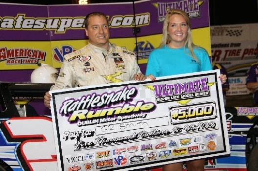 What won the race: G.R. Smith of Huntersville, N.C., took the lead following a lap-47 restart and went on to collect $5,000 for his first career Ultimate Super Late Model Series victory in the Rattlesnake Rumble. Polesitter Dennis Franklin of Gaffney, S.C., led all but the last few laps when his right-rear tire went away.