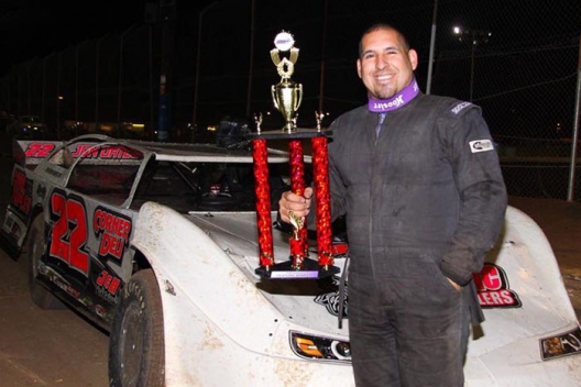 Jon Ortega picks up his first Southwest Dirt Racing Association trophy.