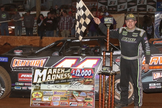 Taking the lead from his second starting position on the opening circuit of the 60-lapper, Madden raced to a relatively easy victory over Scott Bloomquist, finishing 3.150 seconds ahead of the Hall-of-Fame driver from Mooresburg, Tenn. Ross Bailes, the 2017 March Madness winner from Clover, S.C., finished third, while Don O’Neal of Martinsville, Ind., finished fourth. Zack Mitchell of Enoree, S.C., completed the top five.