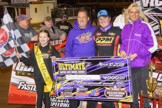 What won the race: Starting outside the front row, Trever Feathers of Winchester, Va., surged into the lead at the drop of the green flag and rolled to a $4,000 victory in Saturday night's 30-lap Ultimate Northeast Super Late Model Series season opener at Hagerstown Speedway.