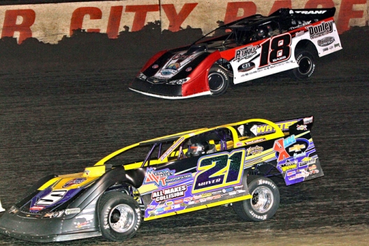 Stalking Billy Moyer for most of the Farmer City 74, the Moweaqua, Ill., driver’s banzai move on the high side on the final lap carried his No. 18 past Moyer’s No. 21 at the checkers for a $10,000 victory in an event co-sanctioned by the Sunoco American Late Model Series and MARS Racing Series.