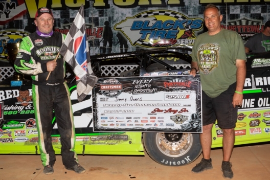 FAYETTEVILLE, N.C. (May 12) — While so many entrants in Saturday night’s First in Flight 100 presented by Hoker Trucking at Fayetteville Motor Speedway were overcome with worries about tire wear, Jimmy Owens of Newport, Tenn., expressed barely the slightest hint of anxiety as he churned toward a $25,001 victory in the inaugural World of Outlaws Craftsman Late Model Series-sanctioned event.