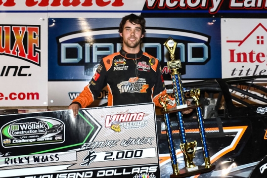 What won the race: Seventh-starting Ricky Weiss of Headlingley, Manitoba, captured the first race of a weekend doubleheader at Viking Speedway. Weiss earned $2,000 and will go for a weekend sweep in Sunday's $2,000-to-win event.