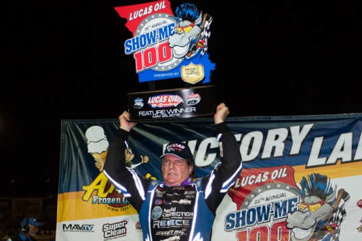 The 54-year-old driver from Mooresburg, Tenn., inherited the lead Saturday on lap 69 when leader Jimmy Owens spun and went on to capture the 26th annual Show-Me 100 presented by ProtectTheHarvest.com in front of a capacity crowd of 8,000 fans. It was Bloomquist's record sixth Show-Me 100 victory — but first since the race moved to Lucas Oil Speedway in 2010 from its original home in West Plains, Mo.