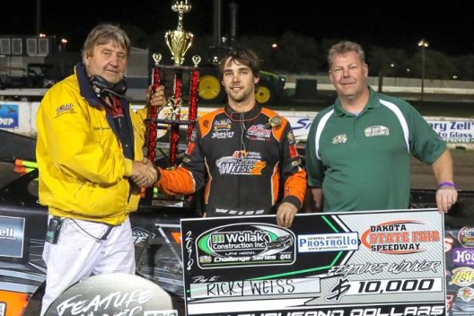 What won the race: Completing a perfect night at Dakota State Fair Speedway, Ricky Weiss of Headingly, Manitoba, drove to victory in Saturday's Challenge Cup XVIII. After winning a pair of heats, Weiss started from the pole and went on to earn a $10,000 payday while outrunning fellow front-row starter Don Shaw in the Wollak Construction WISSOTA Challenge Series event.