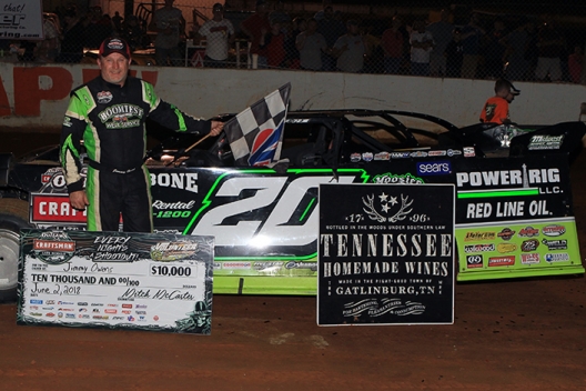 BULLS GAP, Tenn. (June 2) — There’s no denying that Jimmy Owens of Newport, Tenn., is a fan favorite at Volunteer Speedway. The three-time Lucas Oil Late Model Dirt Series champion brought a capacity crowd to its feet on Saturday night, overtaking Chris Madden of Gray Court, S.C., in the final laps to score a $10,000 World of Outlaws Craftsman Late Model Series victory in the East Tennessee Shootout.