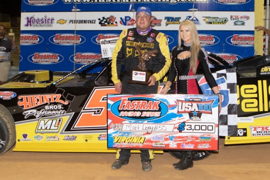 What won the race: Overtaking polesitter Ross Bailes on a lap-17 restart, outside front-row starter Matt Long of Concord, N.C., led the remainder of the 40-lap feature Saturday at Virginia Motor Speedway. Pocketing $3,000, Long beat Logan Roberson to the checkers by 1.065 seconds in the Fastrak Racing Series portion of the USA 100.