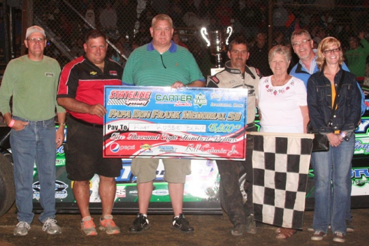 Frank settled for second at the track co-founded by his father Jerry while Mike Knight of Ripley, N.Y., was third. Greg Oakes of Franklinville, N.Y., and Dick Barton of Ashville, N.Y., the track’s winningest active driver with 78 victories, rounded out the top five.
