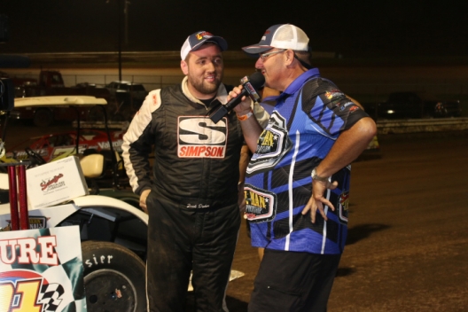 “The car was awesome tonight. I can’t thank Audie Swartz (enough). He builds an awesome race car … best car I ever drove in my life,” said the winner. “Jackie Boggs … I’d be lost without him. He helps me a lot. We kinda do our own deal, but Jackie’s taught me more about racing since I’ve been racing than anybody has.
