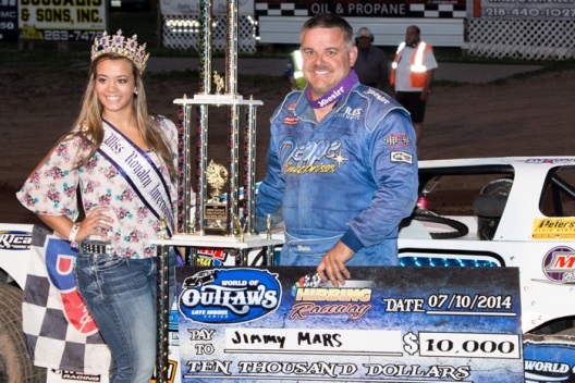 Notes: The feature, which took the checkered flag shortly after 9 p.m. Central, was slowed by only a pair of consecutive cautions on laps 17 and 18. ... Mars recorded his second overall victory of 2014; his previous win came in the National Dirt Racing League-sanctioned Winter Extreme at Tucson (Ariz.) International Raceway on Jan. 18. ... Overall fast qualifier Jordan Yaggy of Rochester, Minn., made his first start since undergoing reconstructive knee surgery that kept him out of the car, but his night soured with a 21st-place finish in the feature. ... McCreadie, who was the fastest qualifier in the second time-trial group, drove Yaggy’s car in last month’s UMP DIRTcar Summernationals event at Cedar Lake Speedway in New Richmond, Wis., while the young driver was sidelined. … WoO regular Shane Clanton of Zebulon, Ga., had to use a provisional to start 23rd but was able to salvage a ninth-place finish. … A huge crowd turned out for the event. … WoO Sprint Car star Donny Schatz was on hand with his Dirt Late Model making his first-ever WoO Late Model start. He won a B-Main and moved forward from the 17th starting spot to finish eighth in the feature. … The WoO Wild West Tour continues on to Deer Creek Speedway in Spring Valley, on Saturday (July 12) before heading to Brown County Speedway in Aberdeen, S.D., Tuesday (July 15) and River Cities Speedway in Grand Forks, N.D., Friday (July 18).
