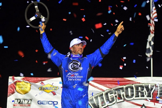 After spending much of the distance calmly saving his equipment while running at the back end of the top five, the 34-year-old superstar came on in the 80-lap feature’s late stages to pull off a dramatic score. He overtook a slowing Bobby Pierce of Oakwood, Ill., for the lead on lap 78 and pulled away on a green-white-checkered restart for his second career win in the half-mile oval’s marquee event.