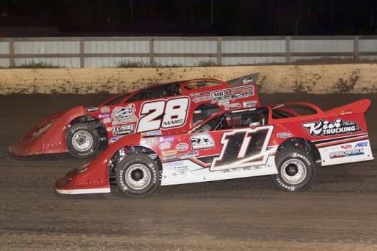 Winner Jimmy Mars (28) battles Pat Doar (11) at Red Cedar Speedway.