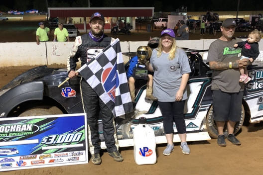Travis Pennington visits victory lane at Cochran Motor Speedway.