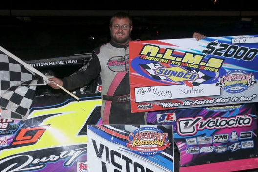 What won the race: Rallying from the eighth row, Rusty Schlenk of McClure, Ohio picked up a $2,000 victory in Saturday night's 30-lap Sunoco American Late Model Series event at Oakshade Raceway.