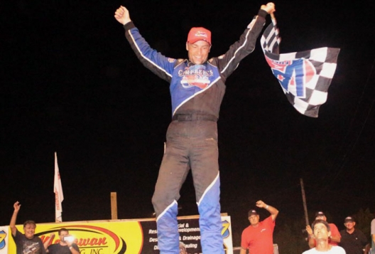 Victor Lee celebrates atop his car at Lake Cumberland Speedway.