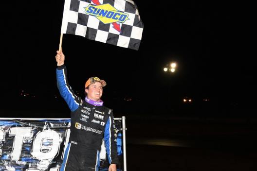 Cory Hedgecock waves the checkers in victory lane at I-75 Speedway.