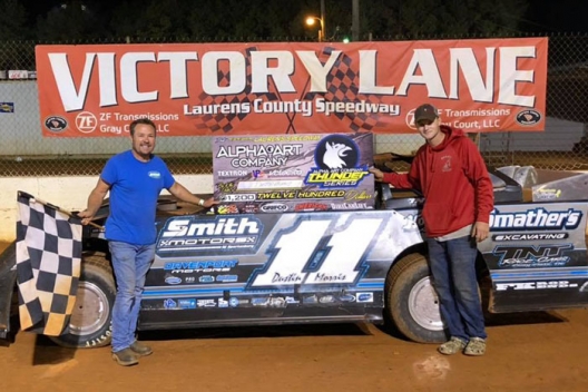 What won the race: Completing a weekend sweep on the Alpha Art Thunder Series, Dustin Morris of Landrum, S.C., earned a $1,200 victory at Laurens County Speedway. Morris took the lead from reigning series champ Dale Timms on the seventh lap and led the rest of the 25-lapper.