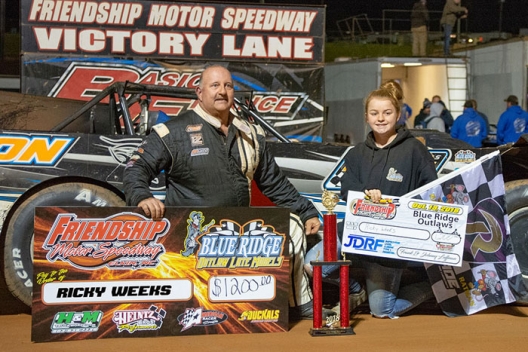 What won the race: Ricky Weeks of Rutherfordton, N.C., won his 14th Blue Ridge Outlaw victory of the season Saturday at Friendship Motor Speedway. Weeks won his third straight series event at Friendship.