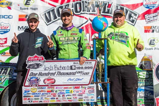 Notes: Richards scored his 25th career Lucas Oil Series victory, the third of his 2018 campaign. … Scott Bloomquist of Mooresburg, Tenn., was previously the only driver to boast back-to-back DTWC victories, winning the event in 2014 and again in 2015. … Richards ended his season-long winless streak during the Oct. 13 World 100 preliminaries at Eldora Speedway, capturing his first victory since February’s Georgia-Florida Speedweeks. … With former team driver Brandon Sheppard scoring his second career DTWC victory behind the wheel of a Best Performance Motorsports entry back in 2016, the team earned its third win in the crown jewel event. … Runner-up finisher Jonathan Davenport was officially crowned the 2018 Lucas Oil Series champion on Saturday afternoon. … Mason Zeigler of Chalk Hill, Pa., is the 2018 Lucas Oil Series Rookie of the Year. ... Chase Junghans of Manhattan, Kan., was the winner of Saturday's Jim Dunn Memorial non-qualifiers' race, electing to forfeit the $3,000 prize and start on the tail of Sunday’s 100-lapper. He finished 10th. ... K.C. Burdette of Parkersburg, W.Va., was the winner of Saturday's $4,000-to-win modified feature.