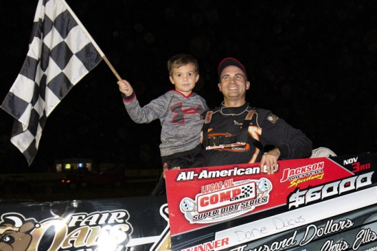 Dane Dacus enjoys victory lane at Jackson with his son Chase.