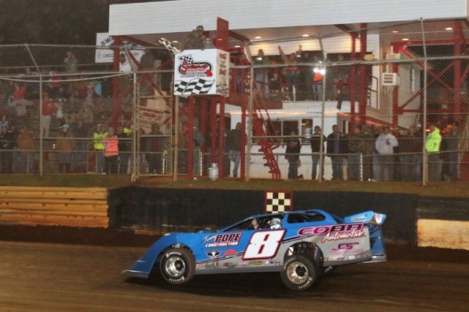 Brandon Overton takes the checkers at Swainsboro Raceway.