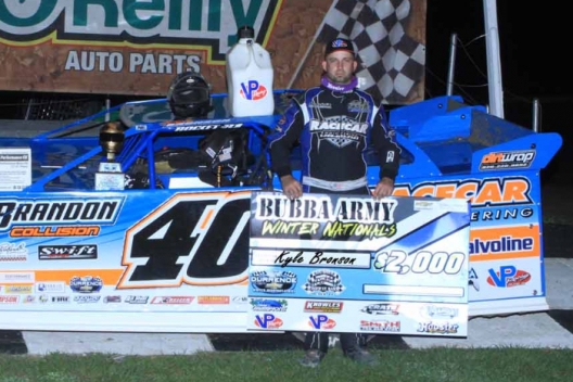 What won the race: Pulling ahead on the opening lap, polesitter Kyle Bronson of Brandon, Fla., led all 40 laps to win Thursday’s Durrence Layne Winter Shootout Series Bubba Army Winternationals opener at Bubba Raceway Park. Bronson tiptoed through lapped traffic over the final few circuits before winning by 1.266 seconds ahead of Walker Arthur. Bronson earned $2,000 in the first of three weekend races on the winter tour.