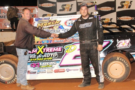 Dustin Mitchell (right) picked up a season-opening Southeastern Late Model Sportsman win at Cherokee.