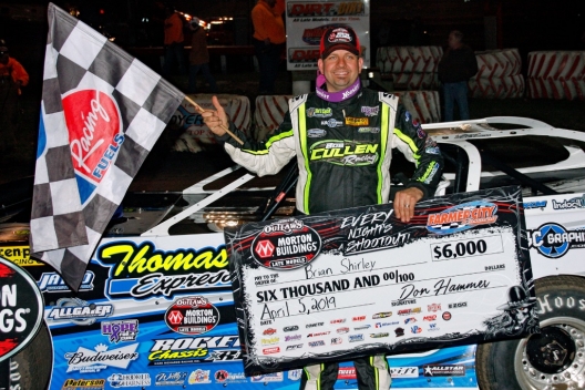 FARMER CITY, Ill. (April 5) — Holding off a late-race challenge from Brandon Sheppard of New Berlin, Ill., reigning DIRTcar Summer Nationals champion Brian Shirley of Chatham, Ill., scored a $6,000 World of Outlaws Morton Buildings Late Model Series victory Friday on the opening night of Farmer City Raceway’s Illini 100 presented by Douglas Dodge.
