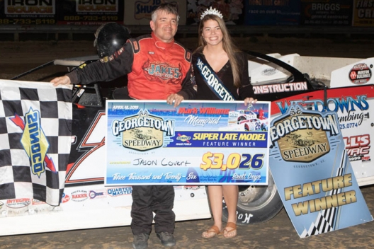 What won the race: Sixth-starting Jason Covert of York Haven, Pa., went from fourth to first on a lap-three restart and cruised the final 23 laps of the Mark "Coot" Williams Memorial at Georgetown Speedway. Early leader and polesitter Austin Hubbard finished 5.269 seconds behind as the runner-up in the $3,026-to-win unsanctioned Super Late Model event.