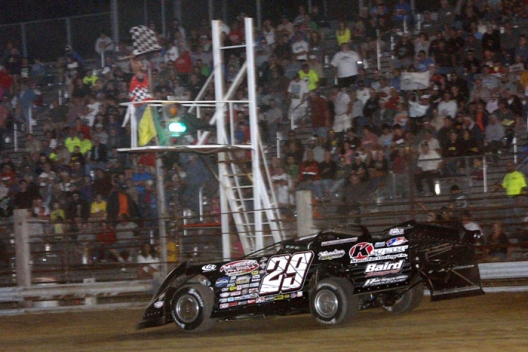 Rick Eckert of York, Pa., advanced from sixth to finish third in the Rocket Chassis house car. Third-starting Tim McCreadie of Watertown, N.Y., used a high-side charge to move his Rocket Chassis to second early in the race before fading back to fourth at the finish. Billy Moyer of Batesville, Ark., finished fifth in his Longhorn Chassis.