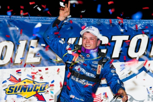 WEST BURLINGTON, Iowa (May 16) — Don O’Neal’s misfortune was just the stroke of luck his son Hudson needed. When the elder O’Neal’s slider with three laps remaining drew contact from race-long leader Jonathan Davenport — bringing out a caution in the process — Hudson was waiting in the wings, ready to pounce on the restart. And pounce he did.