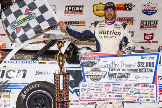 FARLEY, Iowa (May 17) — Just 24 hours after a late-race pass by Hudson O’Neal of Martinsville, Ind., cost Jonathan Davenport a victory at 34 Raceway in West Burlington, Iowa, Davenport made sure no one was close enough to repeat the feat in the waning laps at Farley’s 300 Raceway. Leading all 50 laps, Davenport, of Blairsville, Ga., turned back a mid-race charge from Tyler Erb of New Waverly, Texas, and a pulled away late to win Friday’s Lucas Oil Late Model Dirt Series-sanctioned Truck Country 50.