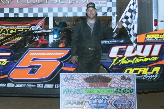 What won the race: Mark Whitener of Middleburg, Fla., outran fourth-starting Eli Beets in Saturday night’s American Crate All-Star Series event at Clay Valley Speedway. Taking the checkers .830 ahead of Beets, Whitener earned $2,000 for his triumph in the second round of the Mayhem in the Mountains.