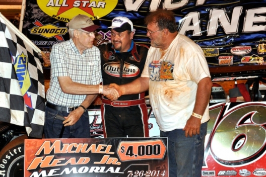 The winner's father Glen Weaver (left) shakes hands with Mike Head after Randy Weaver's victory in the Michael Head Jr. Memorial.