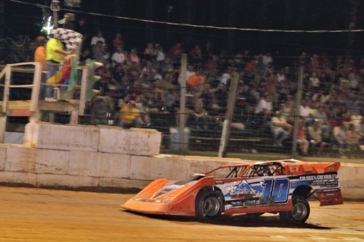 Jared Miley flashes under the checkered flag to complete his stirring charge from the 20th starting spot to win at Clinton County.