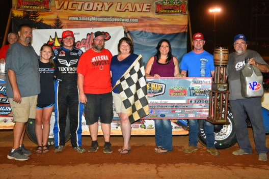 Ashton Winger enjoys victory lane at Smoky Mountain with his crew.