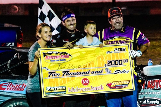 What won the race: Fourth-starting Tad Pospisil of Norfolk, Neb., held off a last-lap challenge from all-time series victory leader Kyle Berck of Marquette, Neb., to pick up a $2,000 victory in the 25-lap Malvern Bank Super Late Model Series event at Boone County Raceway.