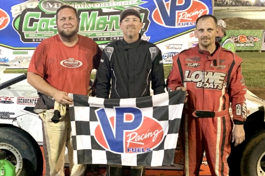 Winner Brad Looney (middle) is joined in victory lane by runner-up Shawn Strong (left) and third-place finisher Mike Hailmann (right).