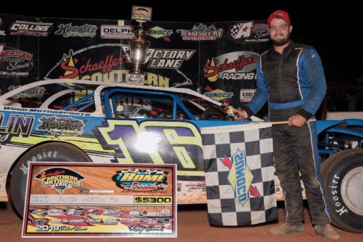 Leading every lap from the pole, Horton won Sunday’s Southern Nationals stop at Rome for his second career series victory and another $5,300 payday. Horton turned back an early challenge from Donald McIntosh of Dawsonville, Ga., before withstanding a mid-race charge from Michael Page of Douglasville, Ga.