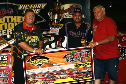 BRASSTOWN, N.C. (July 23) — Fighting back after Kenny Collins of Colbert, Ga., used a slider entering turn four to briefly nose ahead, Jake Knowles of Rome, Ga., won Tuesday’s Schaeffer’s Southern Nationals race at Tri-County Racetrack, his first career win of the Ray Cook-promoted tour. Knowles led every circuit of the 35-lapper, but needed a quick crossover to stay ahead of his good friend and fellow Georgian with just four laps remaining. He kept Collins at bay the rest of the way won by a length.