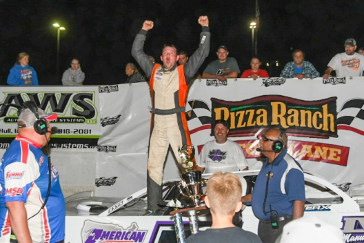 Nate Beyenhof celebrates his last-lap victory at his home track.