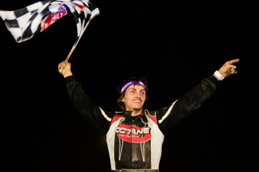 Tyler Carpenter celebrates in victory lane at Hilltop Speedway.