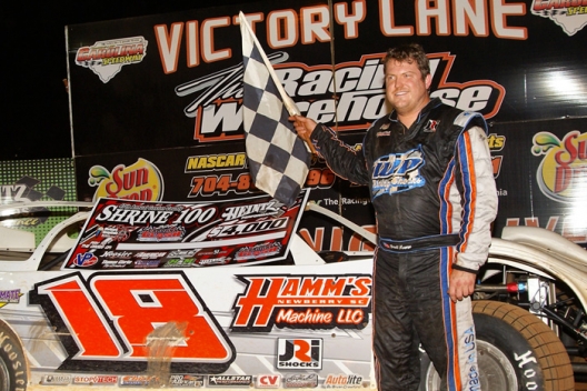 Brett Hamm shows off his checkered flag at Carolina Speedway.