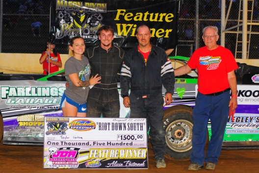 Key notes: Before gaining control of the race, Farlling, who started fourth, watched Kenny Yoder and James Lichliter battle for the top spot. Yoder led laps 1-3 and 13-25 while Lichliter paced laps 4-12. ... Lichliter headed to the pits on lap 25 while challenging Yoder for the lead. ... D.J. Myers of Greencastle, Pa., drove Daulton Bigler's No. 24 to a third-place finish. ... Only 16 of the 24 starters finished the feature, which was postponed by rain on its original Aug. 3 date. ... Sam Archer was slated to start 25th but he was unable to make the call for the A-main.