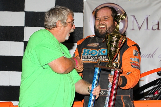 With the seventh-starting Kay five car lengths back in second, Chris Simpson appeared to have the race well in hand until his transmission jumped out of gear, causing him to suddenly slowed entering turn four as he headed to complete lap 30. Simpson rolled up the track as Kay darted by. As quickly as he slowed, Simpson put his car back in gear and took off again. But he’d lost both the lead to Kay and the second spot to his brother Chad Simpson and on a track that became bottom dominant over the second half of the 50-lapper, there was little he could do to regain the positions.