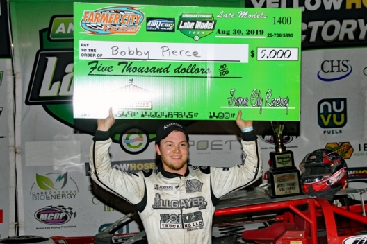 What won the race: Ninth-starting Bobby Piece of Oakwood, Ill., overtook polesitter Jimmy Mars before halfway and captured Friday’s 40-lap American Ethanol Late Model Tour debut at Farmer City Raceway. Recording his first career victory on the Michigan-based tour, Pierce pocketed $5,000.
